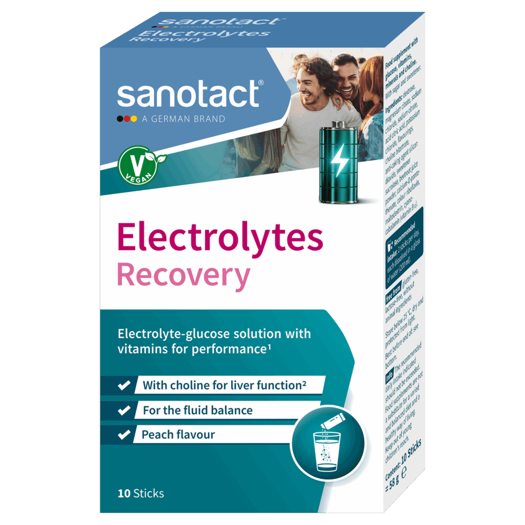 sanotact® Electrolytes Recovery contains glucose, minerals, vitamins and choline. This combination is ideal for balancing fluid levels and supporting liver function and energy metabolism. The vitamin B12 it contains helps to reduce tiredness and fatigue and to support normal mental function. Pantothenic acid supports normal mental performance. Choline supports the maintenance of normal liver function.