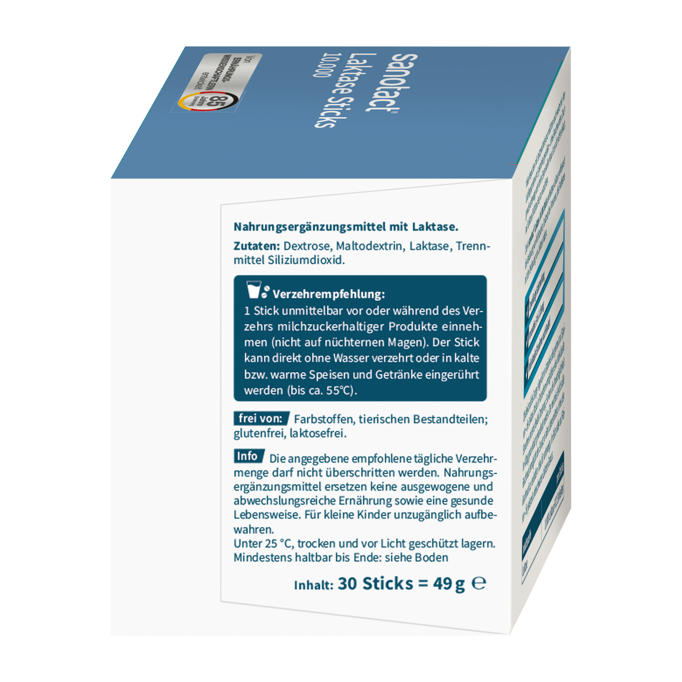 Enjoy without worry – with sanotact® Lactase Sticks. The sticks contain the enzyme lactase, which ensures effective breakdown of milk sugar. With a dosage of 10,000 FCC units per stick, one liter of milk can be digested. This is more than sufficient for most foods and beverages.