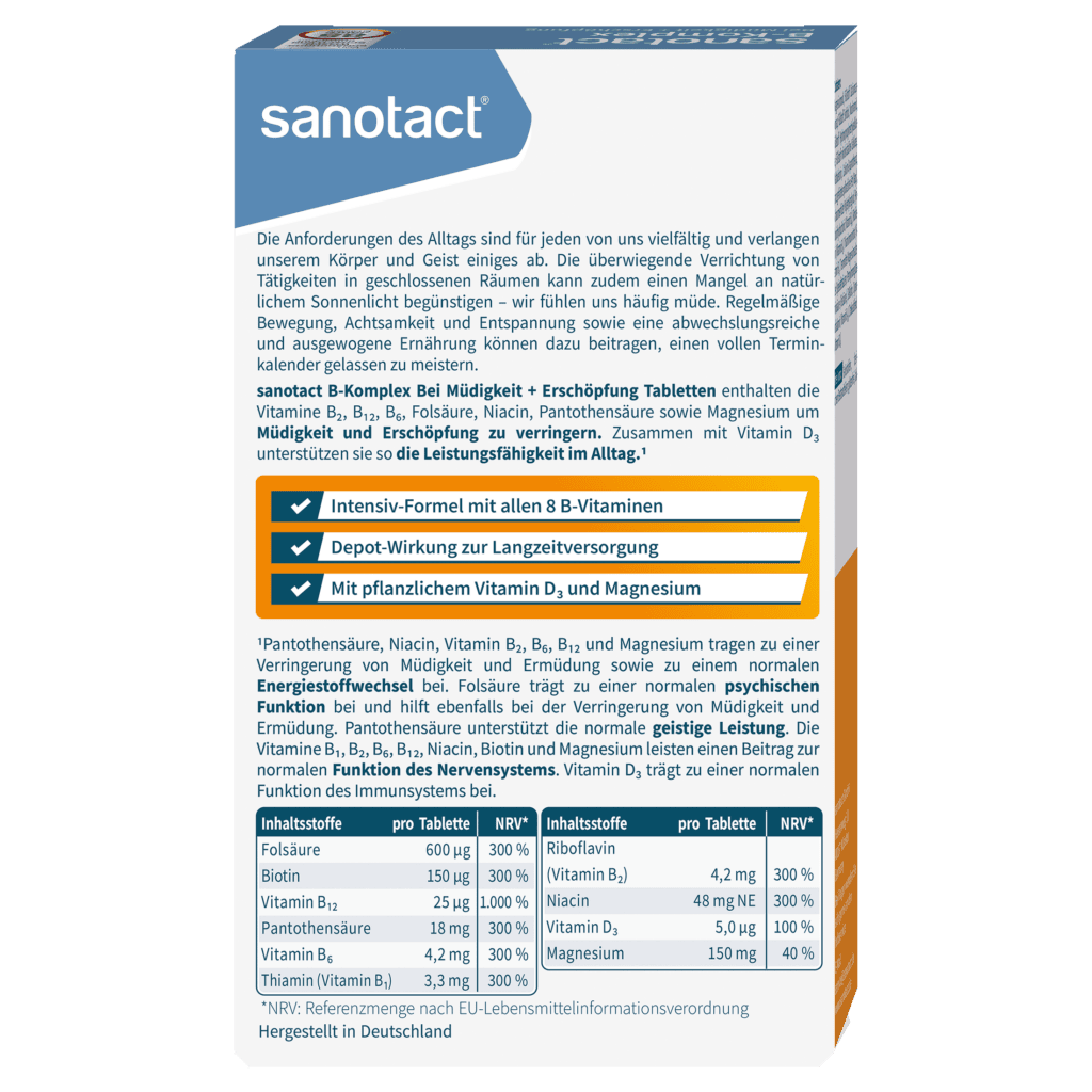 Die Intensivformel der sanotact® B-Komplex trägt mit B-Vitaminen und Magnesium zur Verringerung von Müdigkeit und Erschöpfung bei.