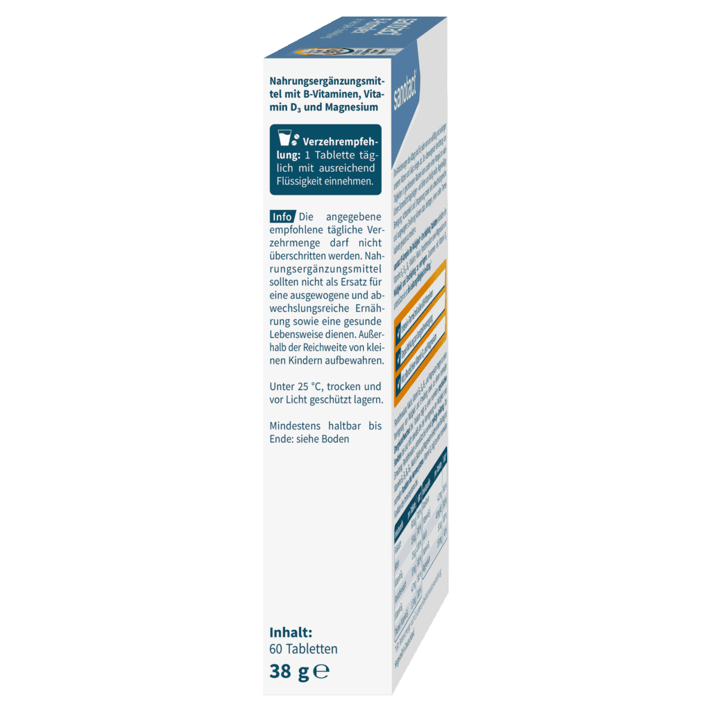 Pantothensäure, Vitamin B6, Vitamin B12 und der Magnesium tragen zu einer Verringerung von Müdigkeit und Ermüdung und zu einem normalen Energiestoffwechsel bei. Folsäure hilft ebenfalls bei der Verringerung von Müdigkeit und Ermüdung. Pantothensäure unterstützt zudem die normale geistige Leistung. Vitamin B6, Vitamin B12 und Magnesium sind zusätzlich an der normalen Funktion des Nervensystems beteiligt und tragen zusammen mit Folsäure zu einer normalen psychischen Funktion bei. Vitamin B6 trägt zur Regulierung der Hormontätigkeit bei.