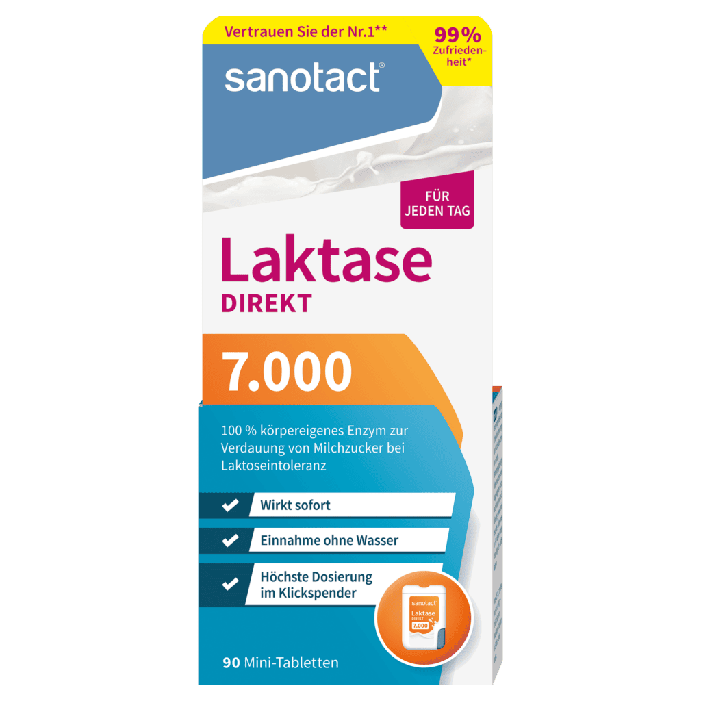 Das in den sanotact® Laktase 7.000 DIREKT Mini-Tabletten enthaltene körpereigene Enzym Laktase spaltet den Milchzucker in die für den menschlichen Körper verwertbaren Zucker Galaktose und Glucose. So können durch die Einnahme des notwendigen Enzyms die typischen Verdauungsbeschwerden wie Blähungen oder Durchfall vermieden werden. Da es sich um ein körpereigenes Enzym handelt, kann Laktase nicht überdosiert werden und es kommt zu keinem Gewöhnungseffekt.
