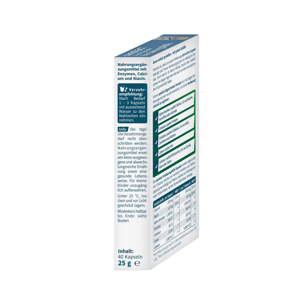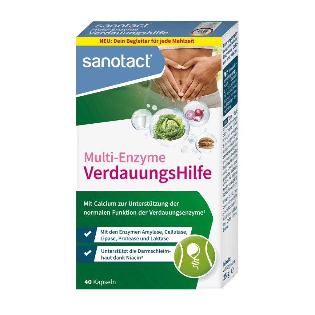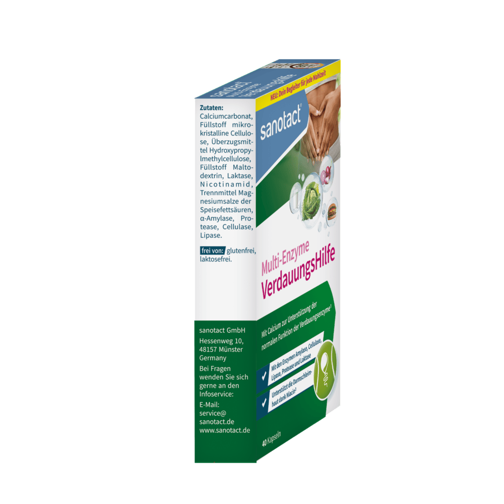 Die sanotact® VerdauungsHilfe Kapseln sind ein wirksames Enzympräparat zur Unterstützung der natürlichen Verdauung. Die Kombination aus den fünf wichtigen Verdauungsenzymen – Alpha-Amylase, Protease, Cellulase, Lipase und Laktase – hilft dabei, Kohlenhydrate, Eiweiße, Fette, Pflanzenfasern und Milchzucker optimal zu spalten. So können häufige Verdauungsbeschwerden wie Völlegefühl, Blähungen oder ein schwerer Magen spürbar reduziert werden. Mit Calcium, das zur normalen Funktion der Verdauungsenzyme sowie Niacin, das zur Erhaltung gesunder Darmschleimhäute beiträgt, bieten die Kapseln eine wertvolle Unterstützung für alle, die ihre Verdauung verbessern oder bestimmte Lebensmittel besser vertragen möchten.